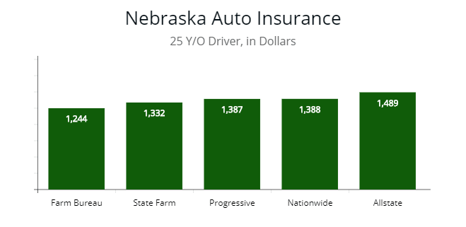 Note: For a 30 year old driver in Nebraska the quotes clustered between $998 and $1,089. The cheapest options are with Farm Bureau Financial (or Mutual), State Farm, and Progressive. Each queried at $998, $1,009, and $1,012 per year for full coverage.
